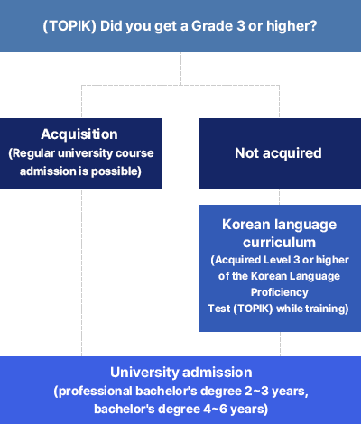 Acquisition of TOPIK level 4 or higher (graduation is possible) -> Graduate School (master's program at least 2 years and doctoral program at least 3 years)